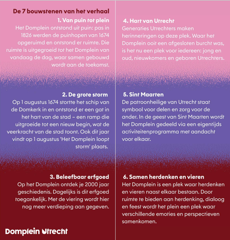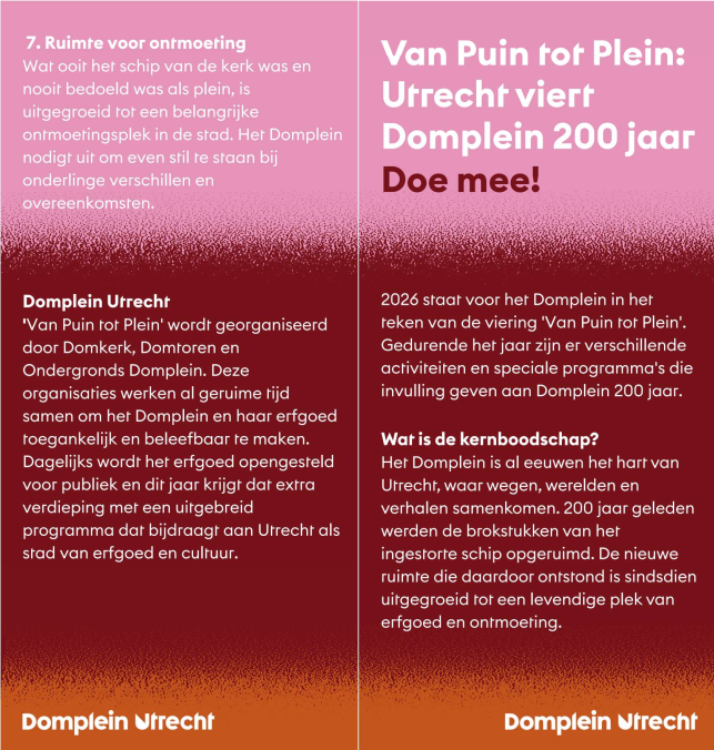 ‘Van Puin tot Plein’ wordt georganiseerd door Domkerk, Domtoren en Ondergronds Domplein. Deze organisaties werken al geruime tijd samen om het Domplein en haar erfgoed toegankelijk en beleefbaar te maken. Dagelijks wordt het erfgoed opengesteld voor publiek en dit jaar krijgt dat extra verdieping met een uitgebreid programma dat bijdraagt aan Utrecht als stad van erfgoed en cultuur.